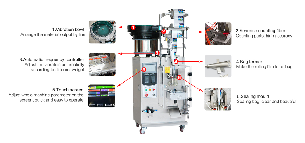 Упаковочная машина MK-LS1 с одним подающим вибролотком и функцией расчета количества упаковок идеально подходит для фасовки и упаковки крепежа и метизов, пластмассовых деталей, электроприборов и т.д. Автоматически осуществляет фасовку, дозирование, формовку упаковки, спайку швов, резку, расчет, печать и транспортировку готовой продукции. Если вам требуются упаковочные машины с особыми характеристиками, пожалуйста, свяжитесь с нами.