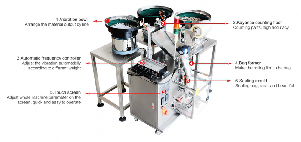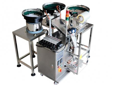Упаковочная машина MK-LS3 с тремя подающими вибролотками и функцией расчета количества упаковок идеально подходит для фасовки и упаковки двух различных материалов, включая крепежи и метизы, пластмассовые детали, электроприборы и т.д.