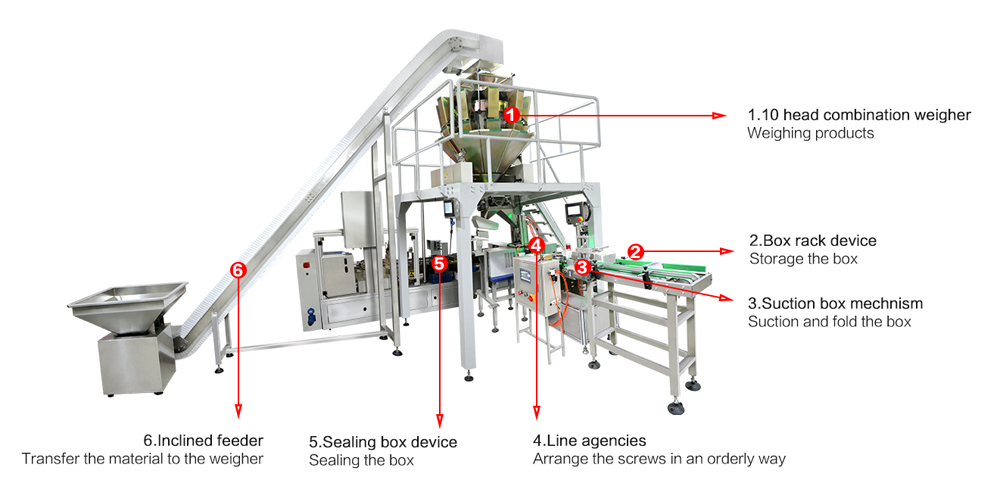 Линия по упаковке изделий в коробки MK-LS-AB предназначена для упаковки изделий в коробки, автоматически выполняет дозирование, вскрытие короба, заполнение и спайку упаковки. Линия оснащена комбинационным весовым дозатором, благодаря чему снижаются производственные расходы и возможна упаковка большого количества и тяжелых металлоизделий, включая гайки, болты и другие. Дозирование легко регулируется согласно потребностям клиентов, удовлетворяя различные требования при упаковке крепежных изделий.