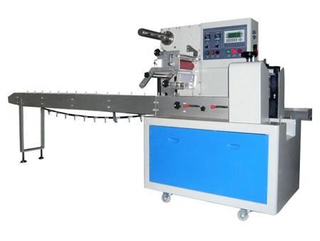 Горизонтальный упаковочный автомат (Flow Pack) MK-350В рулон упаковочной пленки установлен на верхней части поперечного устройства запайки для упаковки продуктов, таких как хлеб, шоколад и многое другое.